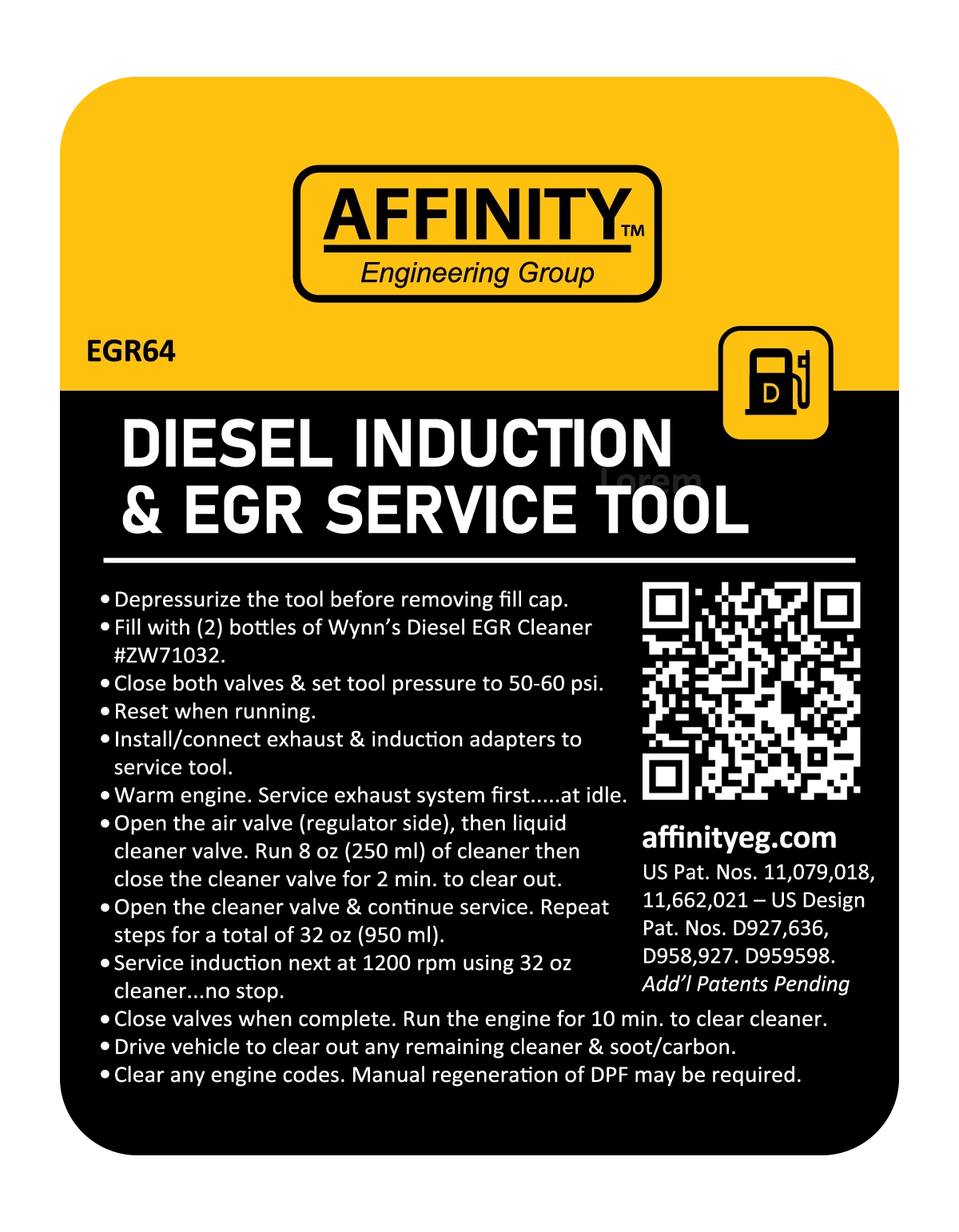 The Affinity EG Diesel Induction and EGR Service Tool provides a simple service to remove exhaust soot from the diesel induction, EGR valve, and exhaust systems where EGR gases flow. Eliminate performance and MIL/Dash warnings caused by reduced cooler and induction flow. Specific job aids are provided for each engine.